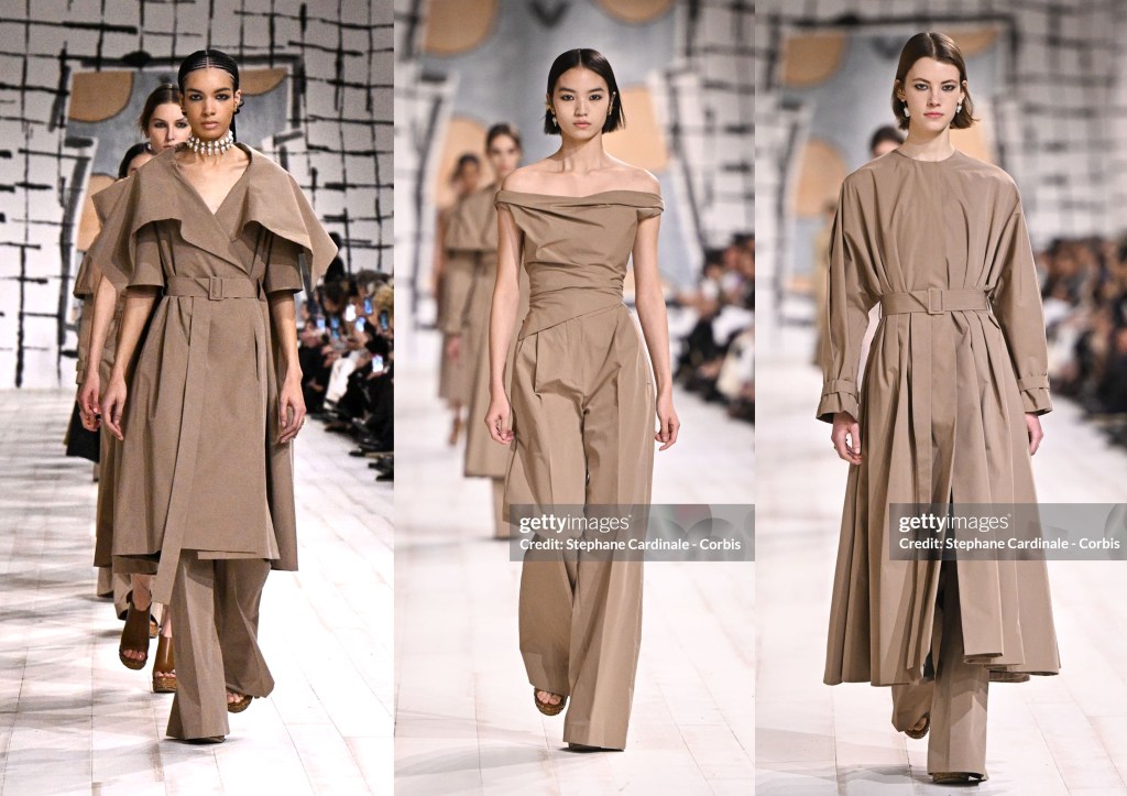 En la colección de alta costura SS24 Dior nos propone unir pasado y presente. El desfile se realizó en los jardines del Museo Rodin, y la escenografía fue realizada por la artista italiana Isabella Ducrot. En la primera parte de la colección se hicieron varias versiones de la gabardina, todas en el mismo tono beige, jugando con pliegues y drapeados.