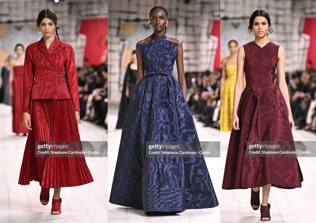 Uno de los aciertos de la colección fue la utilización de maravillosos moirés (un tejido de seda que, mediante el calandrado, provoca efectos visuales ondulados; en este proceso, se dobla el tejido con la faz hacia dentro, y se utilizan rodillos acanalados, altas presiones y temperaturas, lo cual dota al tejido de una textura más suave y con ese efecto de marcas de agua).
