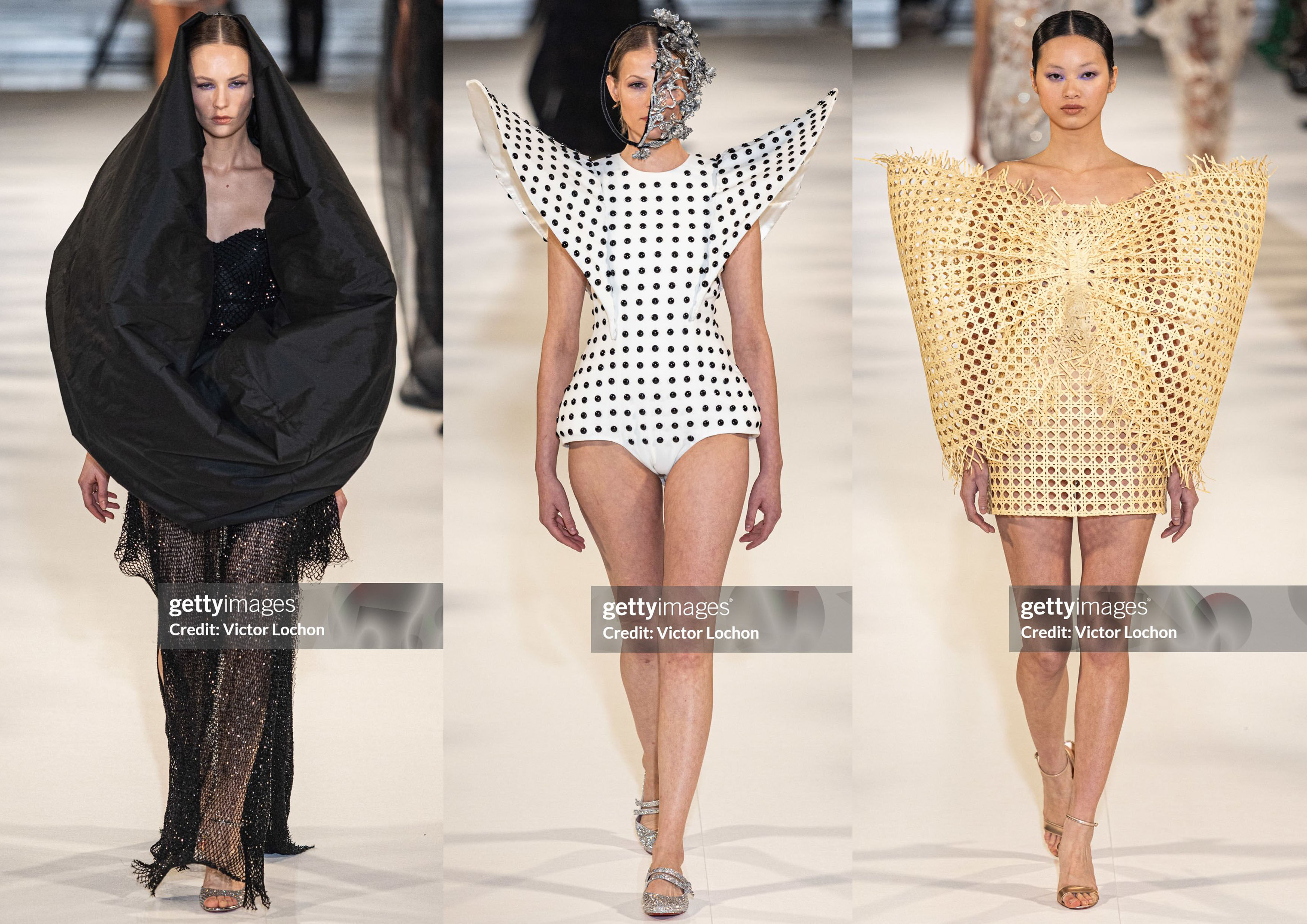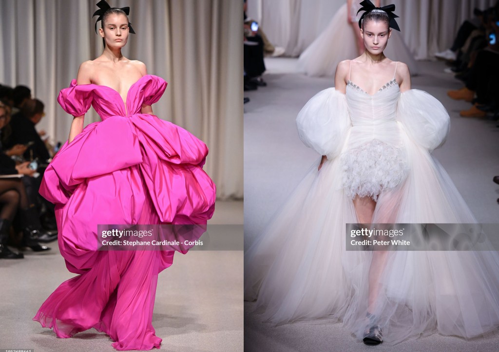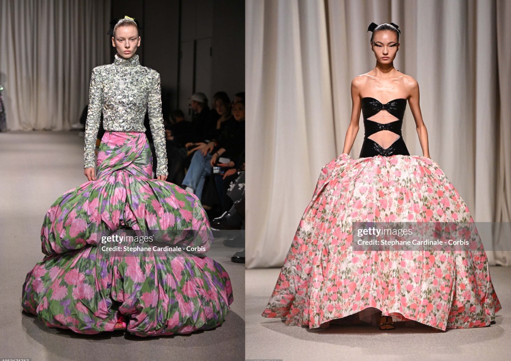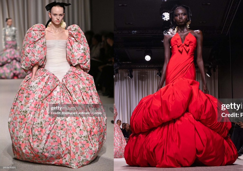 En esta colección SS24, Giambattista Valli nos presenta 40 looks, cuya inspiración, según la nota de prensa del desfile, ha sido: “el arte de dar volúmenes a través de los cortes, a través de la destreza de drapear y realmente traspasar los límites en el taller”. Volúmenes exagerados en faldas y mangas, y verdadera importancia del binomio blanco-negro, al igual que hemos visto en muchas otras colecciones de alta costura de esta temporada.