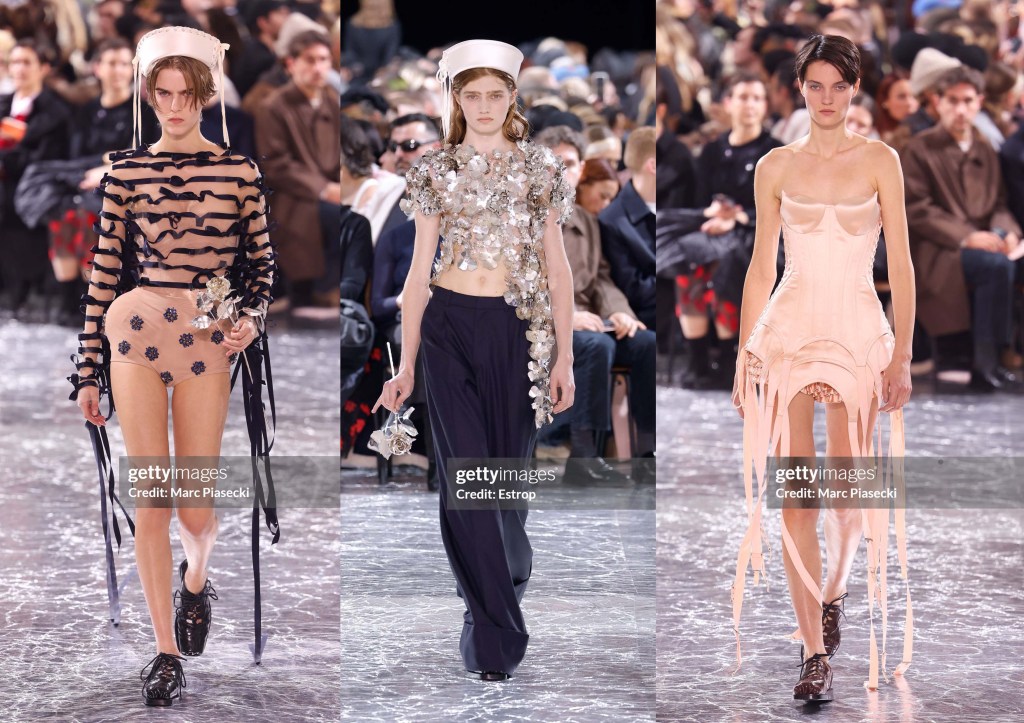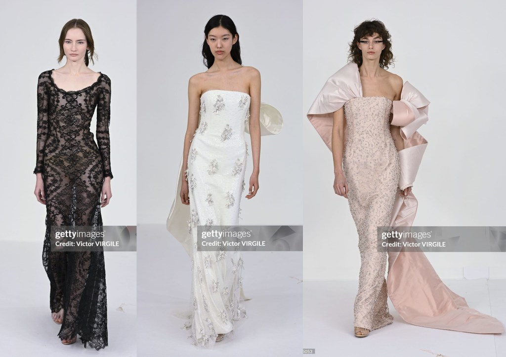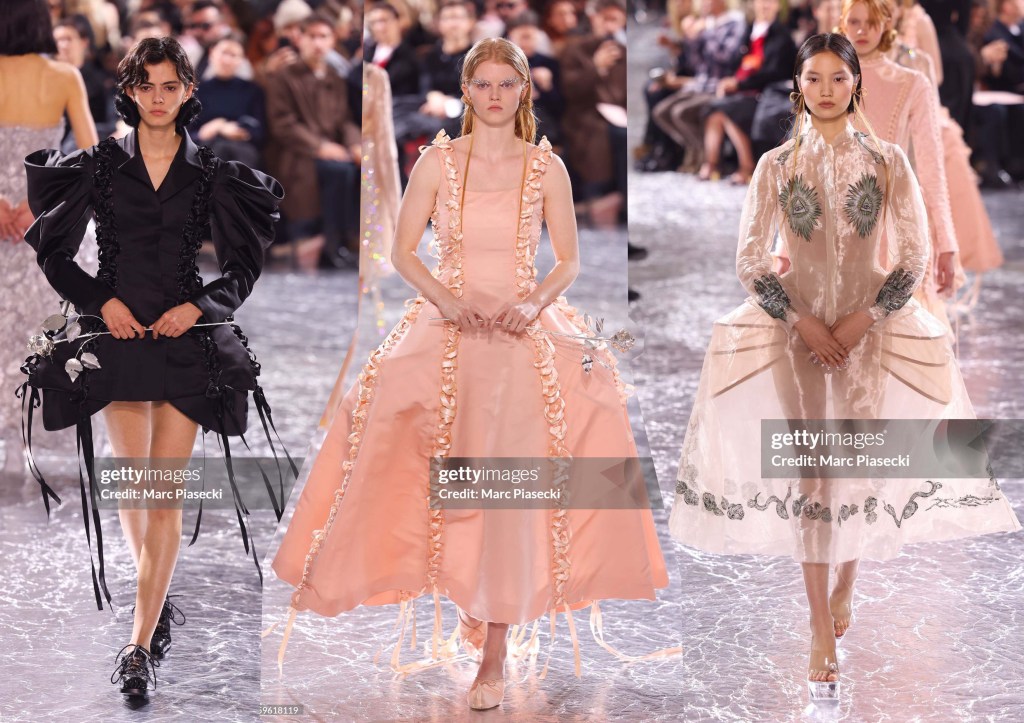 En esta colección SS24, Gaultier ha invitado, como ya es costumbre en él, a una diseñadora que no pertenece a la alta costura, Simone Rocha, para colaborar en el diseño de la colección. ¿El resultado? Varias dosis de genialidad. Nos han presentado 36 looks. Rocha ha tomado referencias pasadas de Gaultier, entre ellas un vestido de cintas rosas de la colección SS2001, que le ha servido de inspiración para un vestido nude con los laterales llenos de lazos del mismo color…