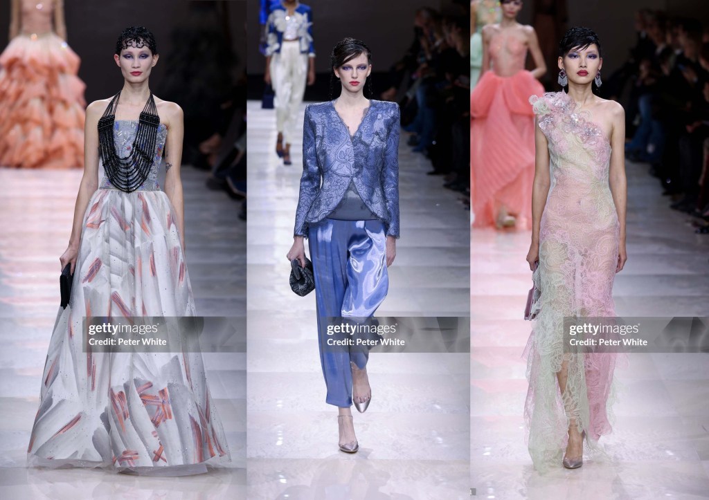 La gama cromática de delicados tonos acuosos infundía a la colección de una cualidad etérea y translúcida. Looks muy voluminosos en tul o gasa de seda que contrastaban con otros más rectilíneos y esbeltos. Armani dijo que había “apostado sin complejos por lo excepcional, como las mujeres de hoy en día apuestan por piezas fuera de lo común”. Los Oscar están a la vuelta de la esquina, veremos si las actrices que ha sido siempre fieles a la marca apuestan de nuevo para la alfombra roja con esta nueva colección.