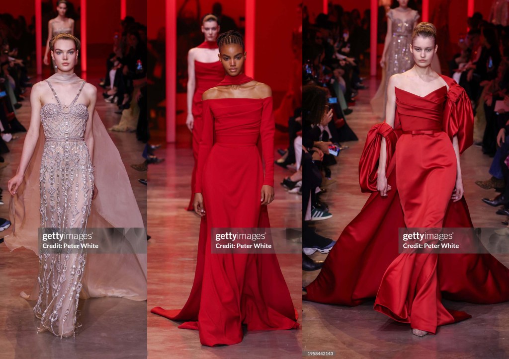 En la parte de la colección más centrada en la noche, vemos tejidos de lúrex, satén, escotes corazón, flecos de lentejuelas, colas de sirena… No es nuestra colección favorita de Elie Saab, pero admitimos que ha sabido crear una estética propia: al ver sus vestidos sabemos perfectamente que en la etiqueta pondrá “Elie Saab”.