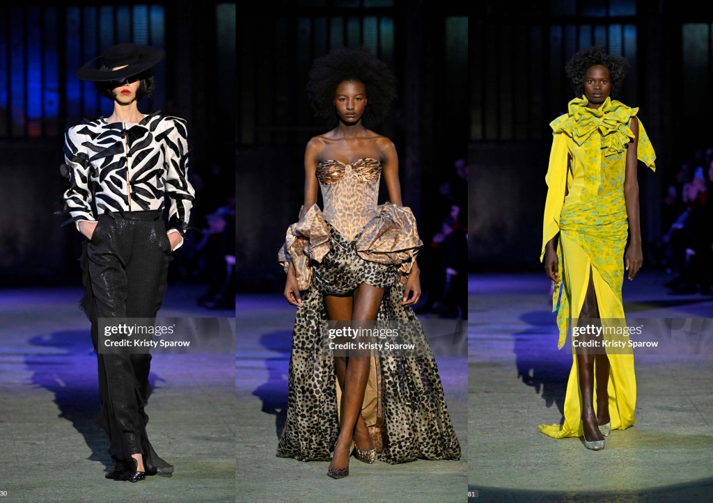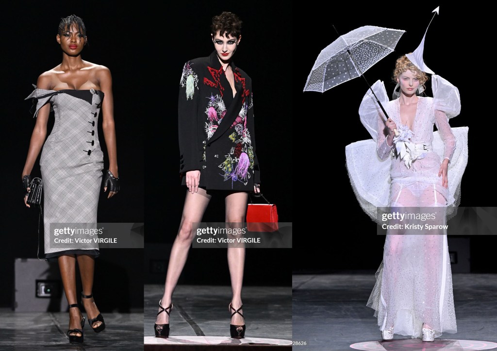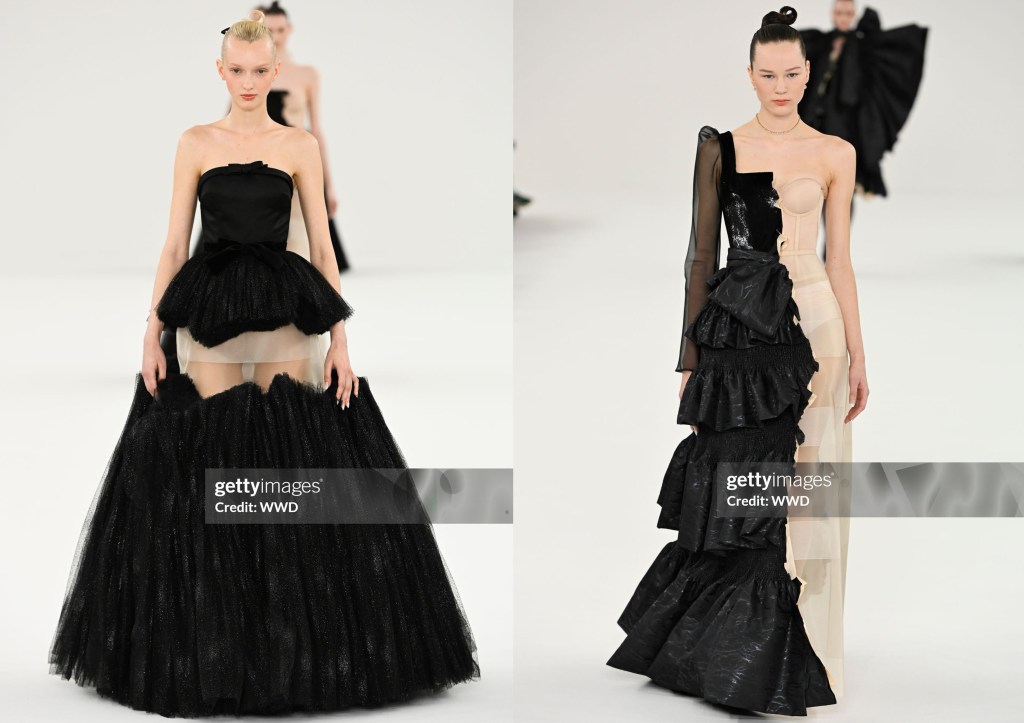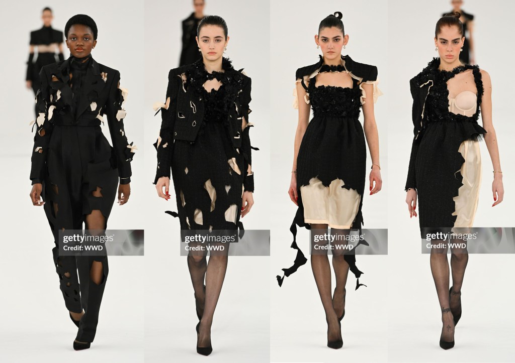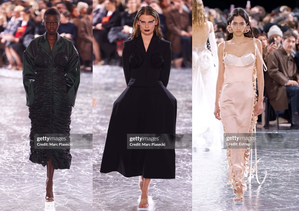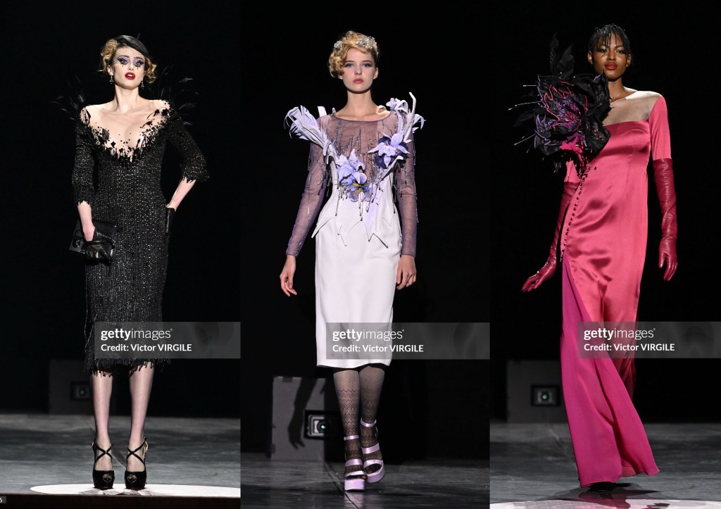 Los looks de transparencias negras nos recuerdan a míticas actrices de los 40s y los 50s, tweed negro con elegantes plumas que salen del escote, tejidos príncipe de Gales, denim, animal print… Todo ello jugando las asimetrías, mangas victorianas, transparencias superpuestas y bordadas… Una colección llena de sensualidad y refinamiento, tacones vertiginosos y flores que salen del escote y la cadera, plantas carnívoras que se apoderan de un corsé… «los brillantes pétalos de las flores muestran sus peligrosas atracciones».