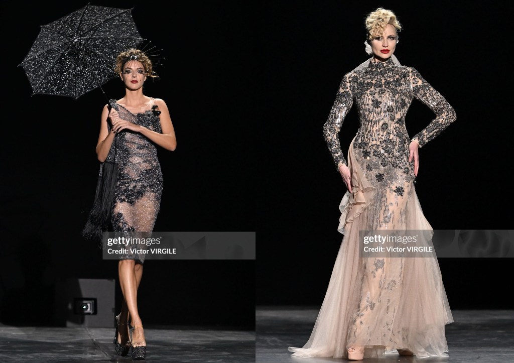 Una colección que mezcla sensualidad y misterio a partes iguales. Las “femmes fatales” de Fournié parecen cortadas con bisturí, siluetas muy marcadas, líneas afiladas y labios brillantes.