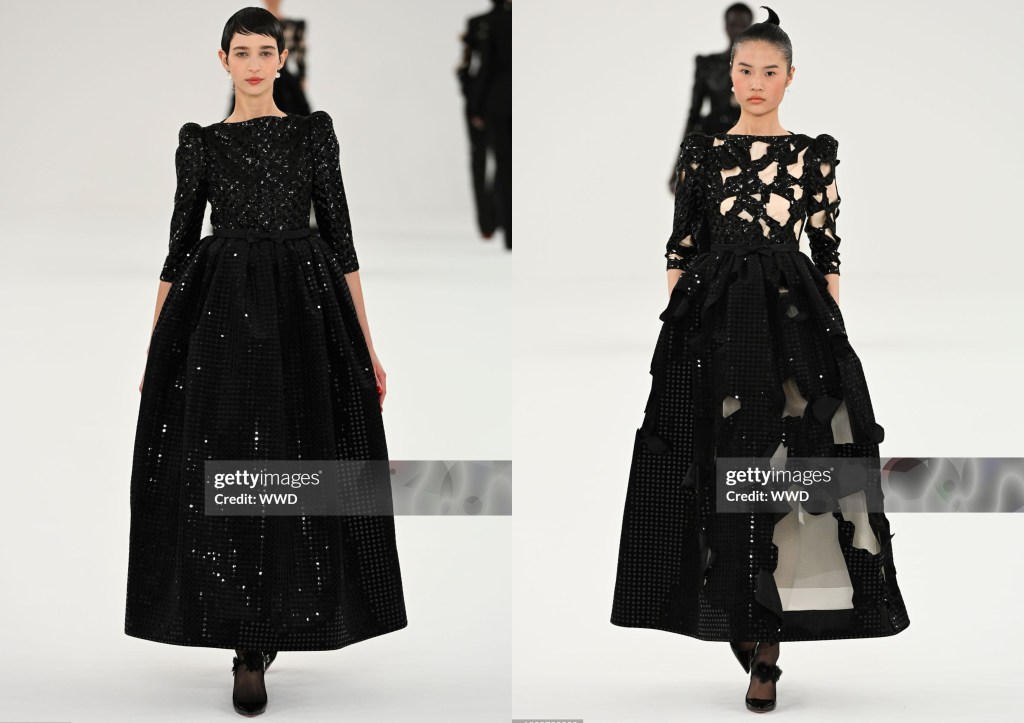 Y no sólo eso, sino que el primer look de cada serie es una referencia a looks de sus colecciones pasadas. Todos los looks siguen una gama cromática bicolor: negro y nude, siendo el negro el color exterior y el nude el color que deja verse tras los recortes, como si pudiésemos ver la combinación que lleva la modelo con rayos X.