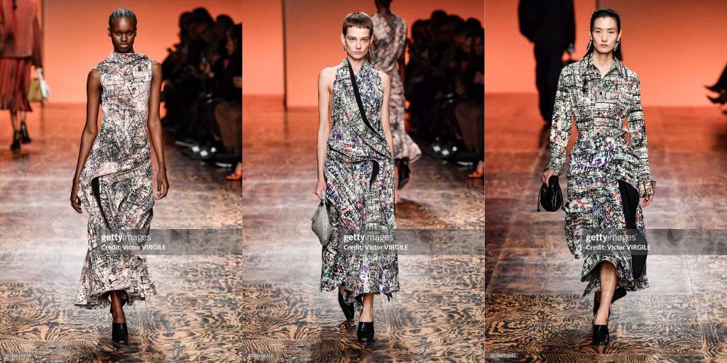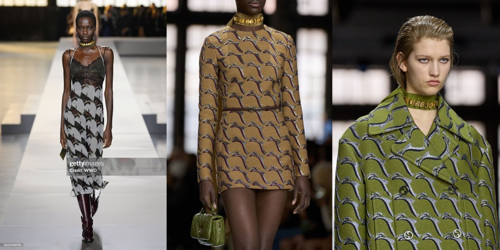 Puede que no sea un diseñador de estampados integrales, pero para el otoño de 2024 ha introducido patrones que parecen una versión abstracta y gráfica de la pata de gallo. El gráfico de los años setenta, vagamente Prada, tanto impreso en los vestidos como bordado como si fuese jacquard, era en realidad una garza.