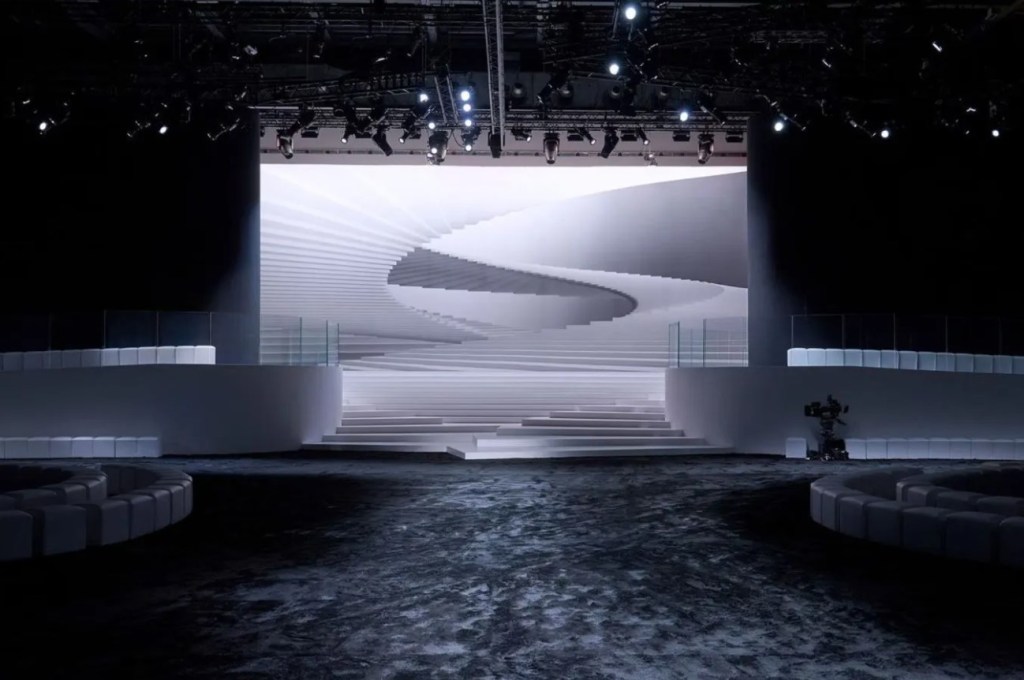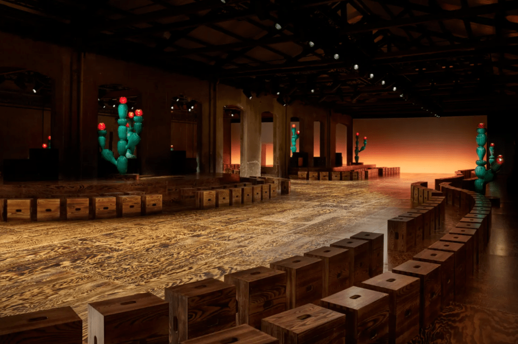 El escenario del desfile recordaba a un paisaje quemado y estéril que parecía abandonado, pero que en realidad sugería una sensación de regeneración, con esculturas gigantes de cactus que rodeaban a los espectadores.