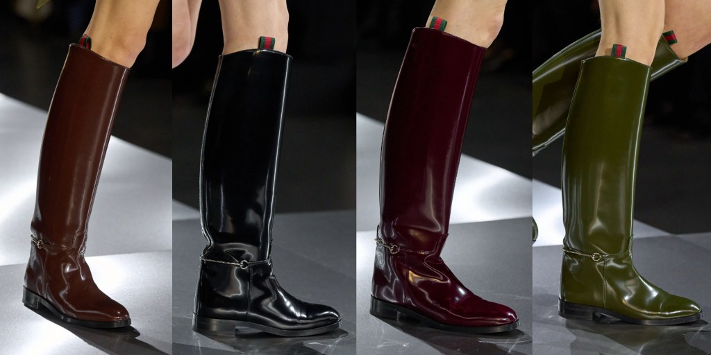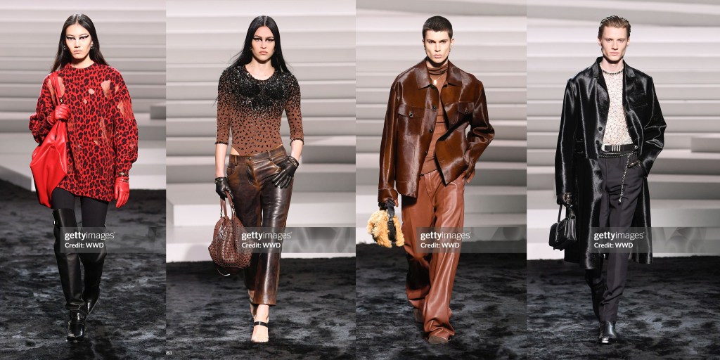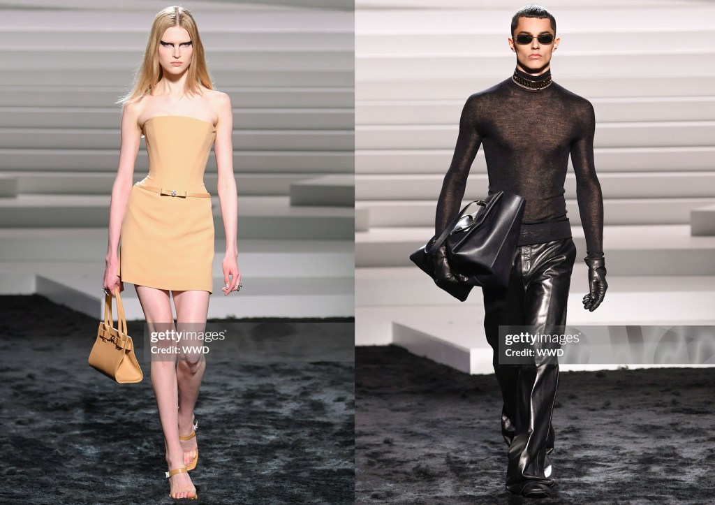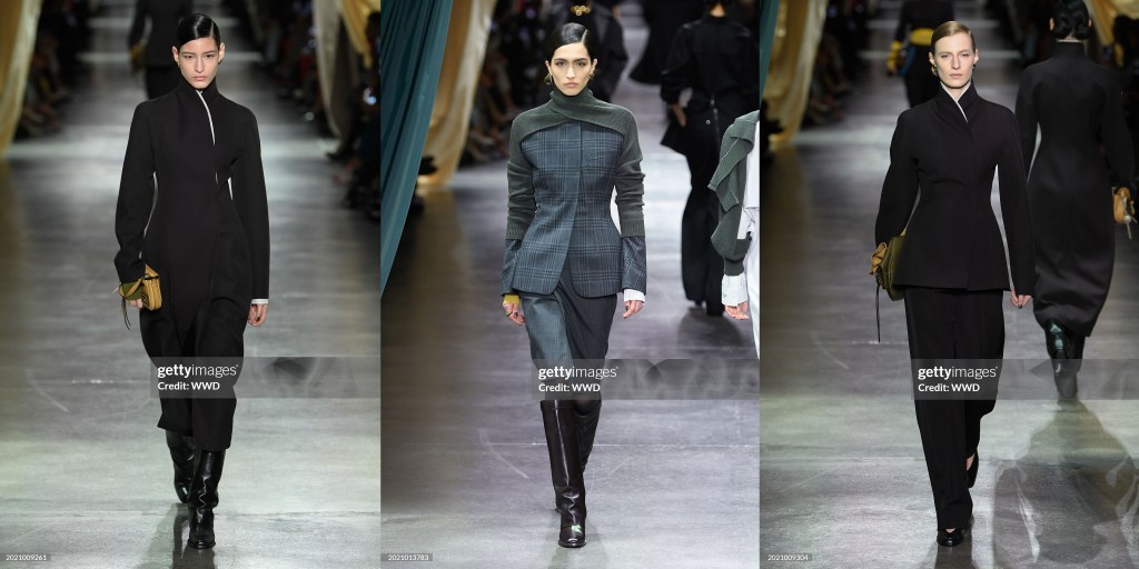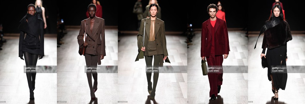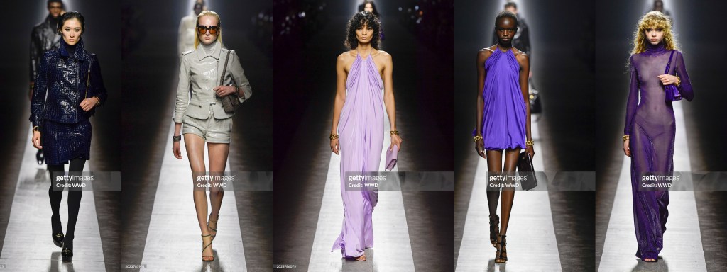 Aunque Hawkings se especializó en ropa masculina con Ford, la sastrería femenina fue el punto fuerte de la nueva colección, como lo fue en su debut. La temporada pasada se repitieron los smokings de terciopelo de la época Gucci de Ford; esta vez fueron sus trajes de tres piezas con chaquetas de solapas anchas, chalecos encogidos y pantalones de talle alto diseñados para abrazar el trasero, «agarrarte por el muslo» y fluir hasta el dobladillo, que se mostraron en gris plateado, rayas diplomáticas y morado vivo. «El ajuste», dijo Hawkings, «es muy importante para mí». Y se notaba.