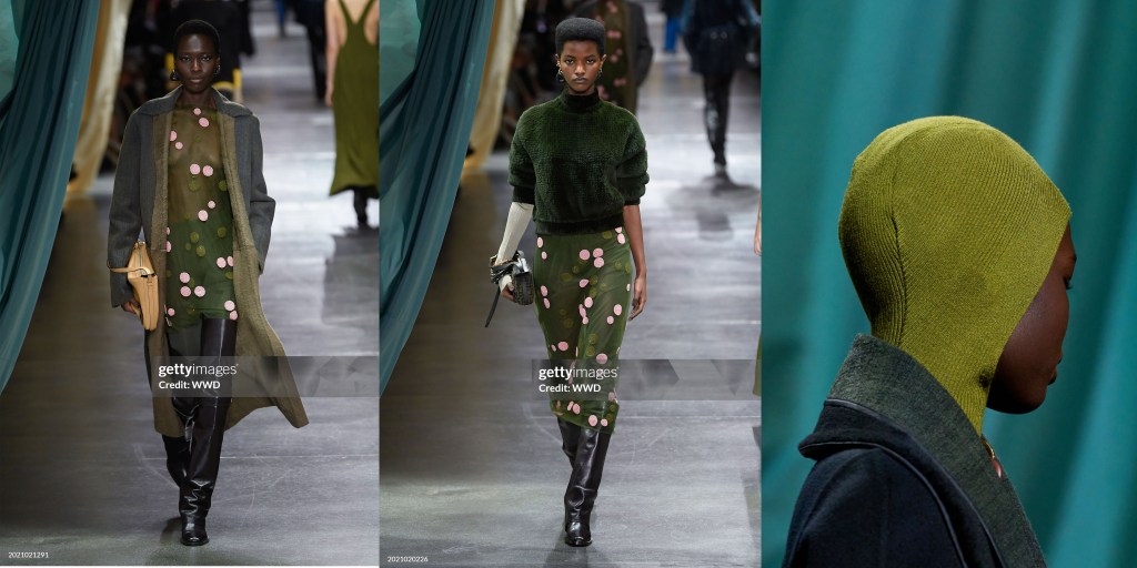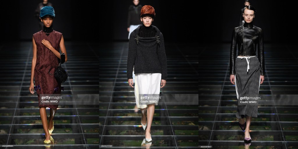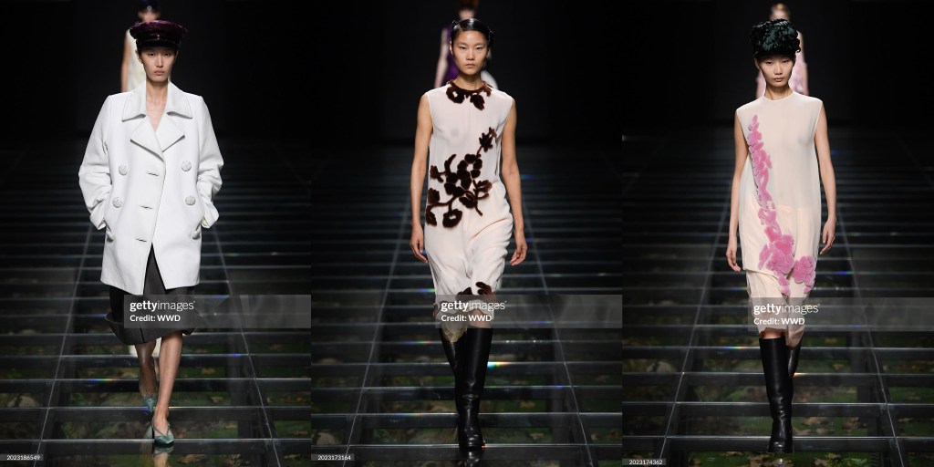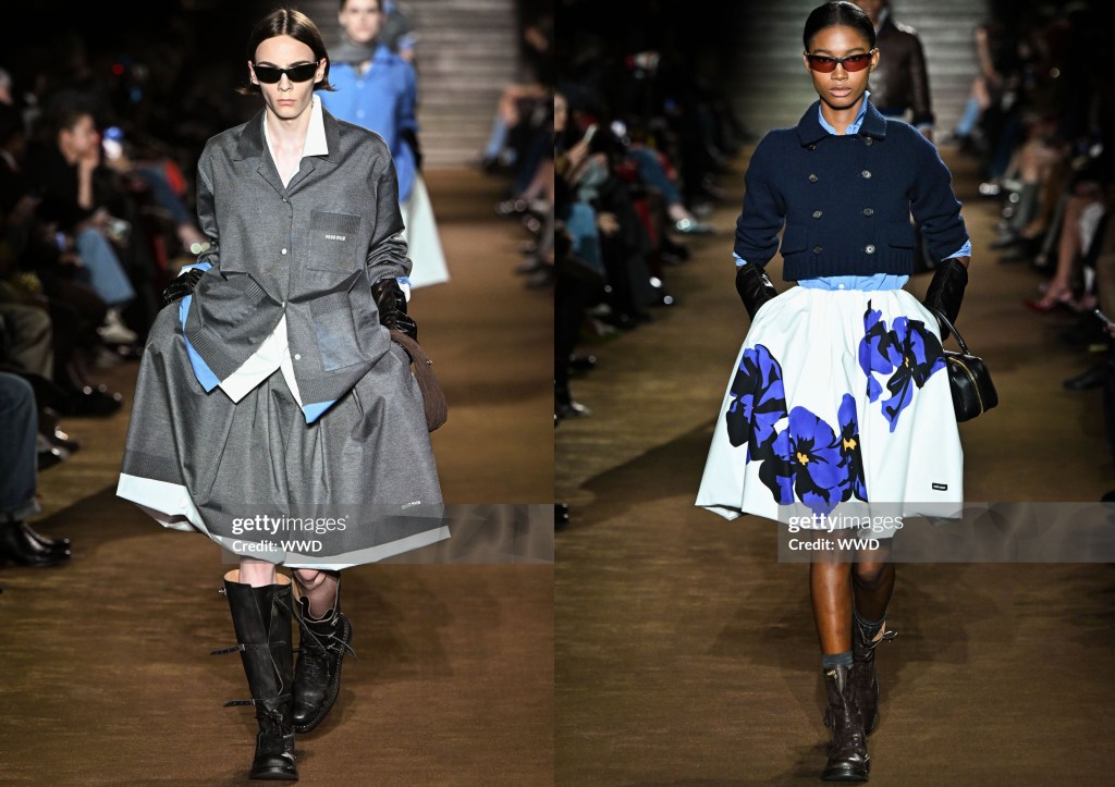 En el ambiente maximalista, cool y “granny-chic” del desfile se vieron pequeños cárdigans de punto, mangas de abrigo recogidas con guantes, trajes de falda y vestidos que parecían sacados de los códigos del vestidito negro o incluso de los uniformes de las sirvientas. La micro minifalda era la tendencia omnipresente que no moría hace unas temporadas, pero esta temporada Prada nos regaló la falda amplia hasta la rodilla con bolsillos. Estas faldas estaban estampadas con flores pintadas y acabadas con grandes y voluminosos dobladillos de burbuja. En un mundo en el que el cuerpo de la mujer siempre es objeto de objetivación, pero nunca se le da libre autonomía, se sintió como un cambio sísmico que alejaba a la chica Miu Miu de lo sexy y minimalista y la devolvía a una chica extravagante y cool que se viste para sí misma y para nadie más.