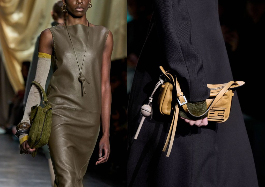 También había humor en los accesorios de cuero y los porta chupa-chups, seguramente una referencia a las discotecas, enganchados a las nuevas versiones blandas del Peekaboo y otros bolsos, o a veces colgados del cuello de las modelos. Dos nuevos bolsos, un satchel de tamaño medio llamado Simply y un shopper más grande y redondeado llamado Roll, fueron creados para ser suaves, flexibles y táctiles, y actuaron como otras piezas heroicas. Fueron los protagonistas de una colección en la que Jones contrapuso lo clásico a lo progresista en varios niveles para exponer una nueva dimensión del alma polifacética de Fendi, fundada hace 99 años.