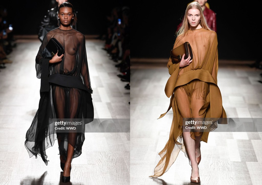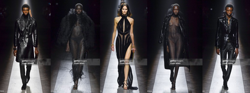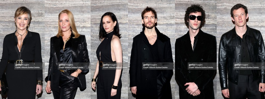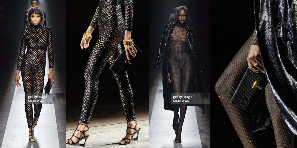 A oscuras, antes de que empezara el desfile de Tom Ford, sonaba repetidamente la música de los títulos finales de Instinto Básico. La propia Sharon Stone estaba en primera fila, acompañada por Uma Thurman, Eva Green, Sam Claflin, Dominic Sessa y Callum Turner. Los paparazzi no se cansaban de fotografiarlos. Peter Hawkings, ahora en su segunda temporada en Tom Ford, hace moda que busca el calor, literalmente; los trajes de noche, en particular, están diseñados con el ojo puesto en los focos.
