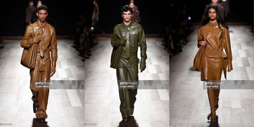Cuando se pasó a las versiones rojizas y marrones de conjuntos similares, parecía que nos adentrábamos más de lleno en el territorio del Fall 2024. Junto a los vestidos de organdí lacados y las transparencias hiperfemeninas, los acabados de plumas y los bordados de lentejuelas, los armarios de las mujeres que eligieron vestirse con siluetas masculinas se reflejan en hombros anchos, lanas pesadas, y pieles flexibles. En sastrería, las solapas afiladas y esculturales connotan un espíritu más surrealista.