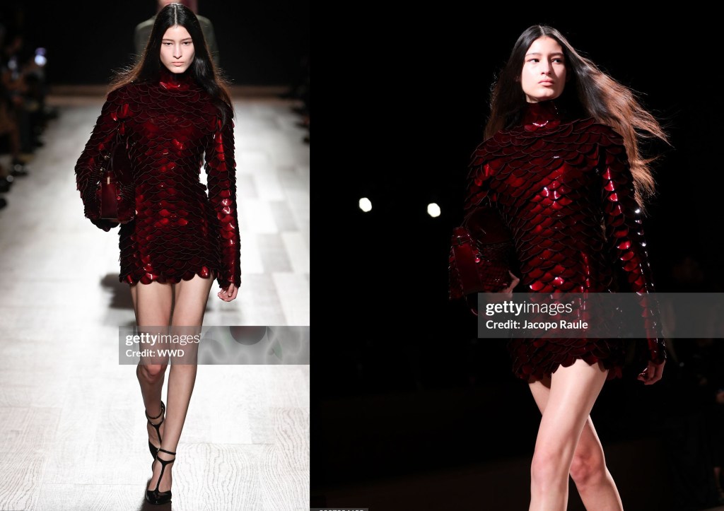 Las llamas pintadas aparecían en forma de dibujos sobre cuero o se mimetizaban de forma abstracta con el movimiento de los looks fil coupé (el fil coupé es una técnica en la que se cortan selectivamente los hilos de la tela para crear un diseño texturizado o decorativo, suele realizarse en organza de seda). Además, las serpientes transformadoras abundan en toda la colección, desde los bolsos envolventes y la nueva interpretación del cinturón serpiente hasta los pendientes de esmalte en espiral.