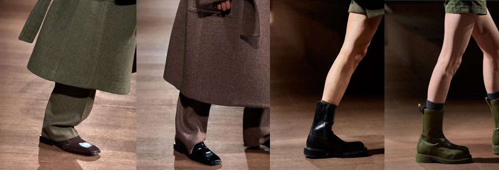 Cuando incorpora adornos, suelen combinar con el color base, de modo que se funden con la prenda y parecen una extensión natural de ella. Luego están los zapatos, que, en su mayoría, se dividen en dos grupos muy diferentes, pero igualmente llamativos: maxi botas de cuero planas hasta la rodilla, y más allá de ella, o mocasines con grandes plataformas.