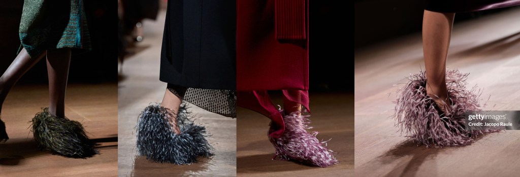 Otro de los grandes aciertos de la colección fueron los zapatos. Davis defendió las enseñas de la marca de los años 20, revitalizando los zapatos de tacón de satén con escote corazón, los tacones de aguja con barra en “T” y las sandalias de tiras de los archivos de Ferragamo. Las piezas más masculinas incluyen “derbies” alargados con tacones cuadrados y botas funcionales. “Siempre despojo las cosas”, explica Davis. “Me gusta tomar una parte rica de la historia y luego restringirla para hacerla más limpia, más moderna”. Los zapatos que más nos han llamado la atención son los que parecen estar hechos de plumas de marabú.