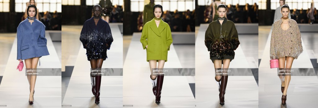 En el preestreno, dijo que esta vez se había propuesto una especie de reto: combinar “lo que odio con lo que amo para hacer algo nuevo”. Así, los abrigos, que abrían el desfile, estaban cosidos de la cintura hasta el bajo con paillettes dégradé (no le gustan los bordados), y tanto un vestido de bustier estrecho como una túnica hasta la cadera estaban cortados en cachemira de lana de doble faz en un tono verde que su equipo de estudio tradujo como “podrido” (un color no tan agradable como el Rosso Ancora).