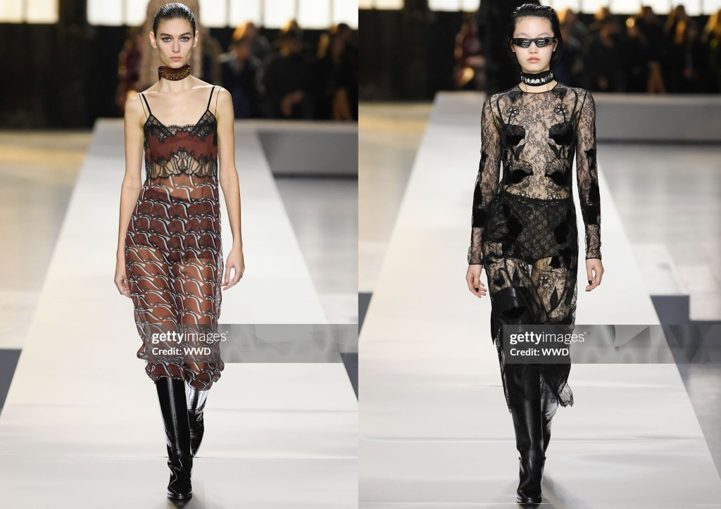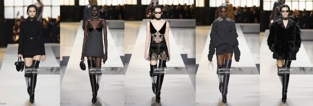Al final, los “gestos subversivos” que prometían las notas de prensa no fueron demasiado evidentes. El look de apertura era un traje de pantalón corto, la chaqueta cuidadosamente entallada y abotonada hasta el cuello, con un fino cinturón que marcaba la cintura y botas de montar por encima de la rodilla que llegaban casi hasta el dobladillo del pantalón corto: minimalismo en la misma línea general que el debut de De Sarno, exquisitos vestidos de encaje negro y las plataformas slingback, que se inspiraron en los mocasines de la colección de lanzamiento de De Sarno.