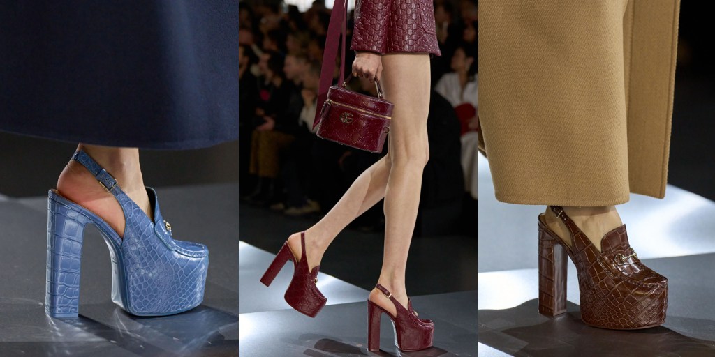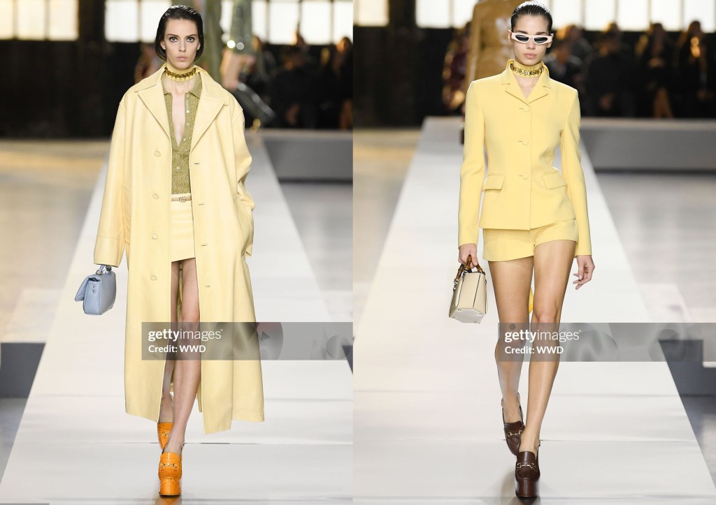 La paleta de colores de Gucci para el otoño de 2024, al igual que la de la primavera, está repleta de colores chartreuse (verde amarillento/licor), burdeos y berenjena. A De Sarno le siguen gustando los pantalones cortos con plataformas muy altas, y sigue siendo un fan de los adornos, aunque no en todos los looks, para reforzar el impacto de las paillettes de colores combinados en abrigos y vestidos de gasa.