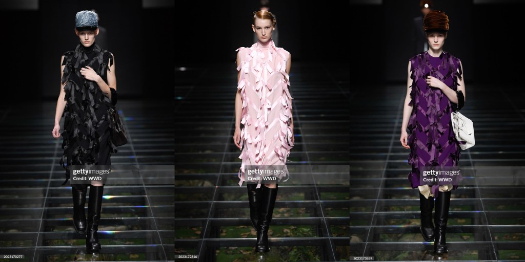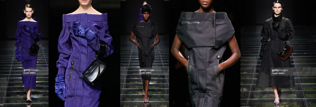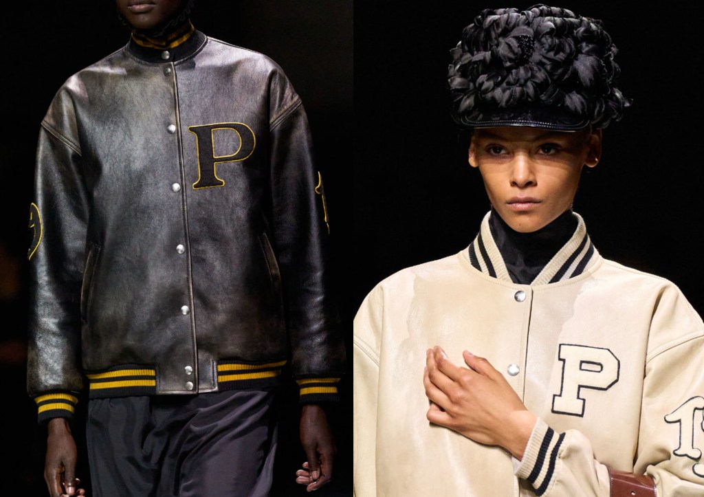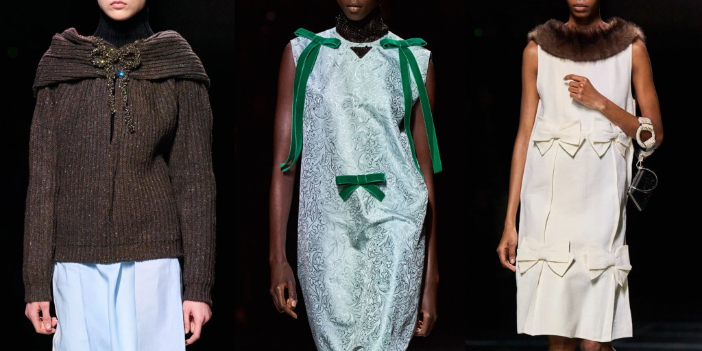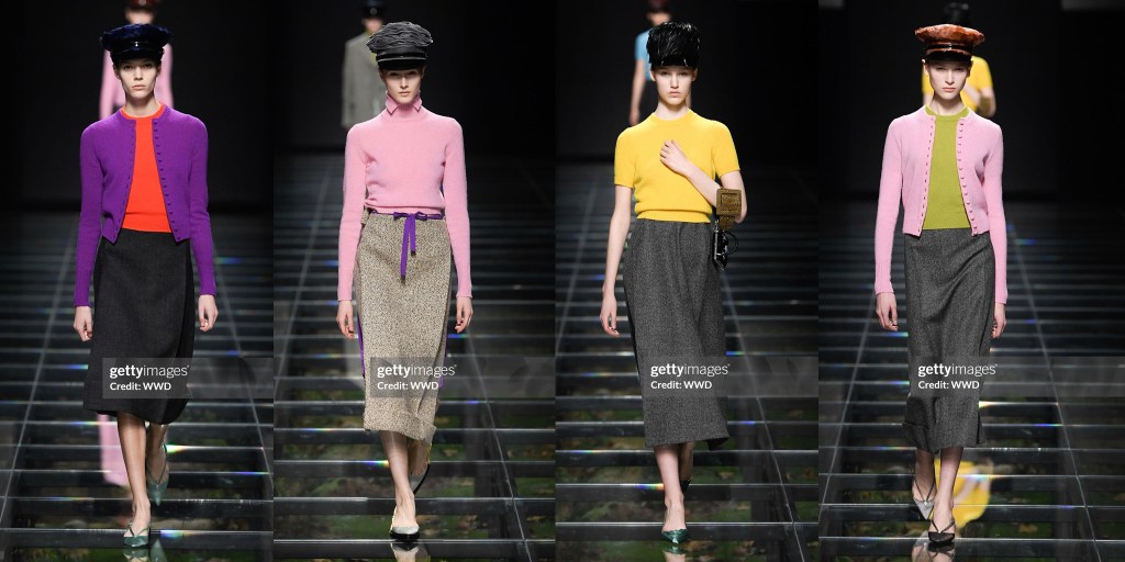 Cuando el presente parece duro y aterrador, y las perspectivas de futuro aún más sombrías, el pasado surge para todos. Prada y Simons no sólo jugaron con los lazos. Había chaquetas tipo “cartero” con parches de la «P» en el pecho y el año de fundación de Prada, 1913, cosido en los brazos; había conjuntos de jersey de niña en colores desparejados que se llevaban con faldas hasta la rodilla y de largo midi.