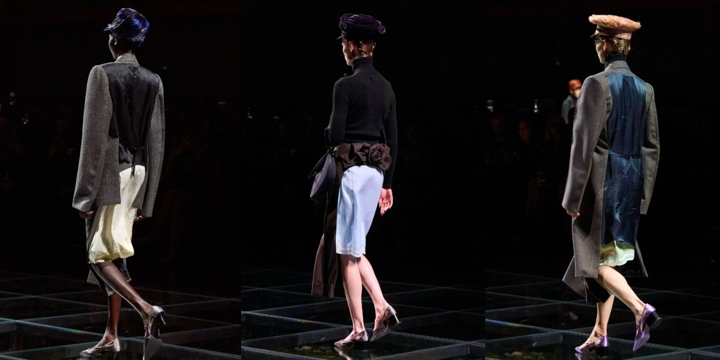 Gran parte de la colección era distinta por delante y por detrás. A Prada nunca le han gustado las cosas tontas, divertidas o estúpidas, así que ¿había algo político en este proyecto de reivindicación? En el backstage, los diseñadores hablaron de romanticismo, amor y emoción, así como de historia. “La historia te lo enseña todo. Especialmente en los momentos difíciles”, dijo Prada en un comunicado de prensa. “Esta es una colección moldeada por la historia. No se trata de nostalgia, sino de comprensión”.
