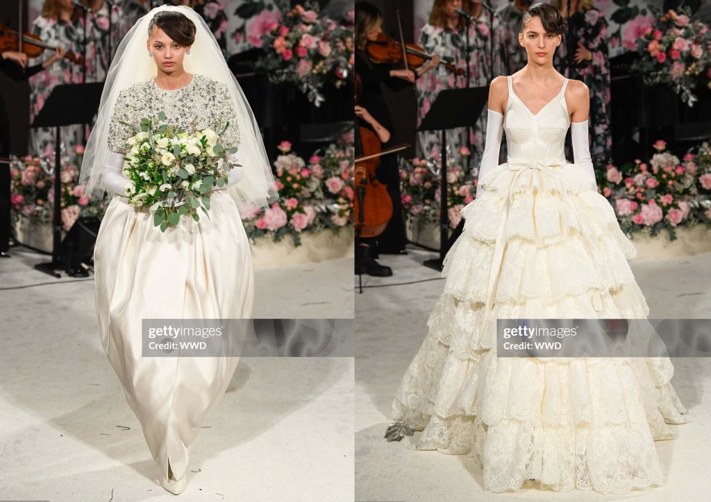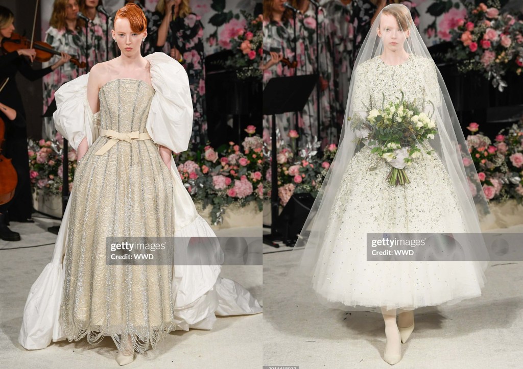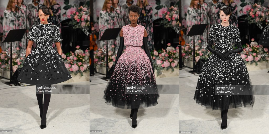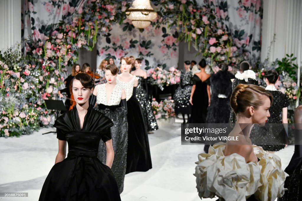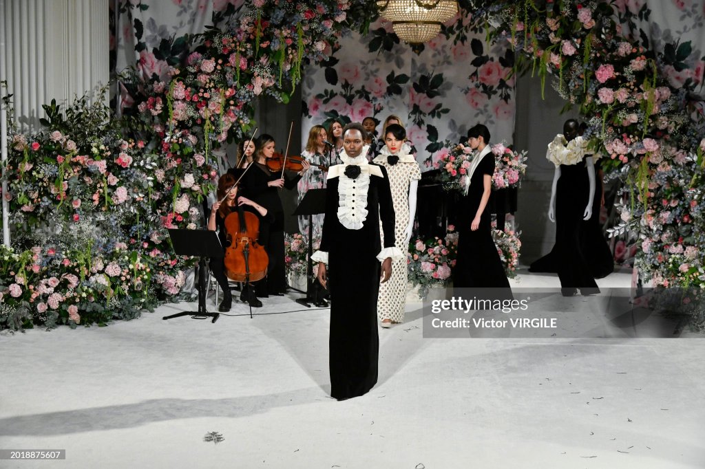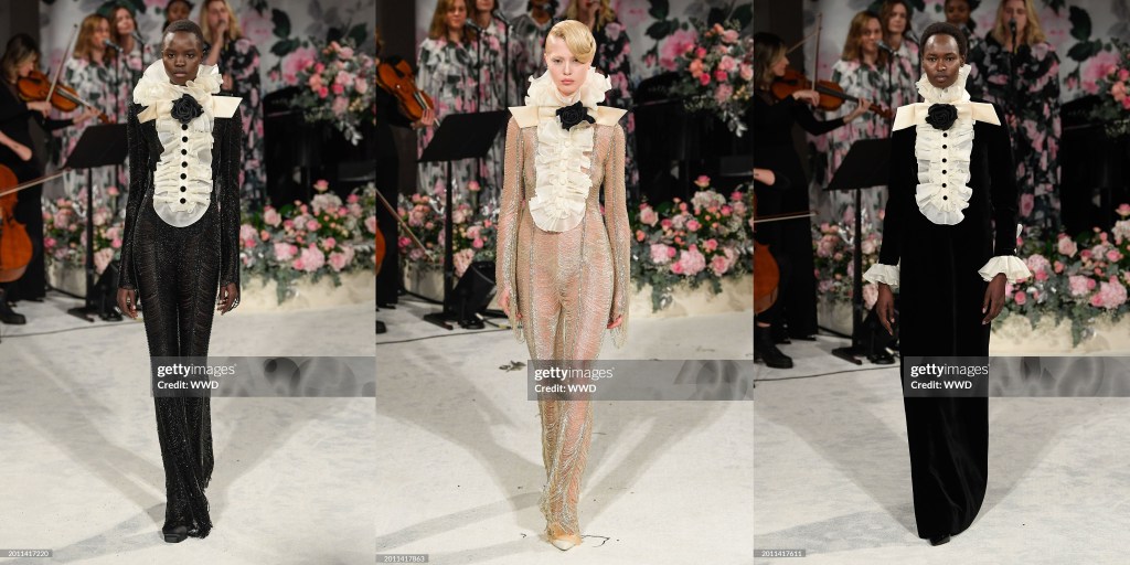 Llamémoslo demi-couture o confección a la antigua usanza, cualquiera de las dos opciones es válida. Alrededor de una cuarta parte de la colección era nupcial, una sinfonía de vestidos con falda completa, corpiños adornados y tul en tonos marfil. Hubo un importante conjunto de vestidos y trajes de chaqueta que se inspiraron, como ya hizo Saint Laurent en su día, en los trajes de noche masculinos tradicionales. Estos trajes, colgados de temblorosas capas arqueadas de hilo de cuentas, presentaban petos con volantes; junto con los tradicionales trajes florales de Quinn, que se llevaban bajo vaporosas colas con dobladillos de plumas, evocaban una especie de ambiente glam-rock de lujo. Los vestidos con rejilla de cristal o salpicados de diminutas flores de lentejuelas eran variaciones reconocibles de la estética de Quinn, presentados con estilo y cuidado, y que pasaban regiamente a pesar del ocasional desacuerdo desestabilizador entre el tacón, el dobladillo y la alfombra.