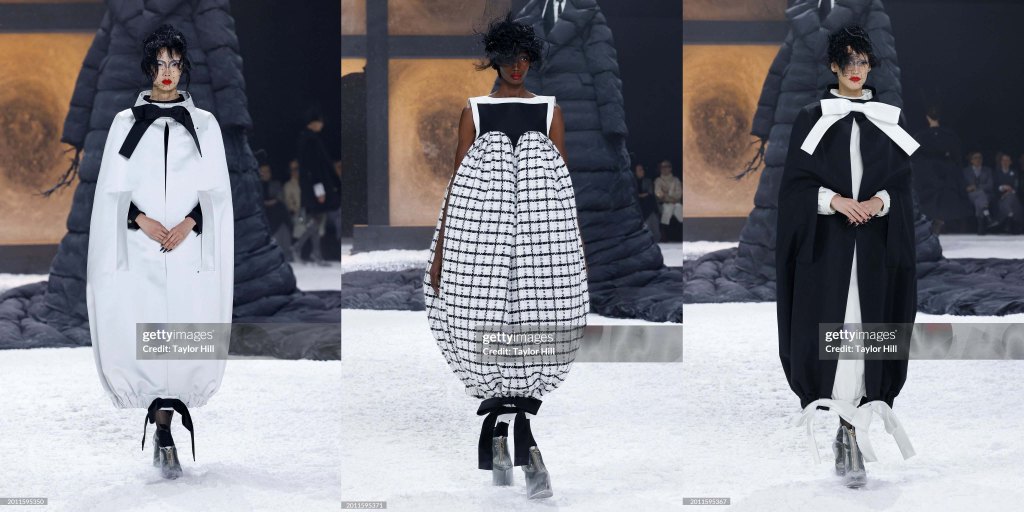 Matthieu Blazy hablaba entre bastidores sobre el día a día: “Empezó mirando las noticias; en el mundo en que vivimos, ¿qué podemos hacer?”, preguntó. “La idea inicial era reducir la colección casi a la función, pero no reducirla al mínimo, sino al máximo. Me interesaba hacer un monumento de lo cotidiano”. En un mundo en llamas, hay un estoicismo en lo mundano, donde vestirse a diario puede convertirse en un acto de resistencia. Aunque se trataba de prendas para ir a la oficina, salir a cenar o pasear al perro por la noche, gracias a sus volúmenes únicos, no había nada cotidiano en ellas.
