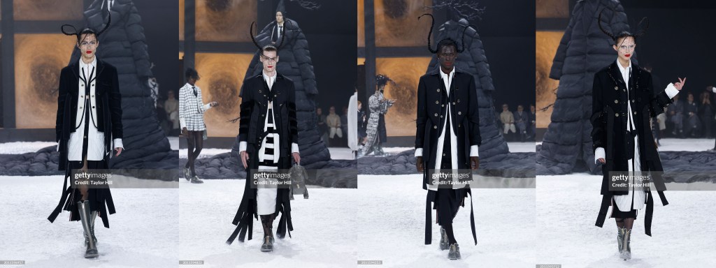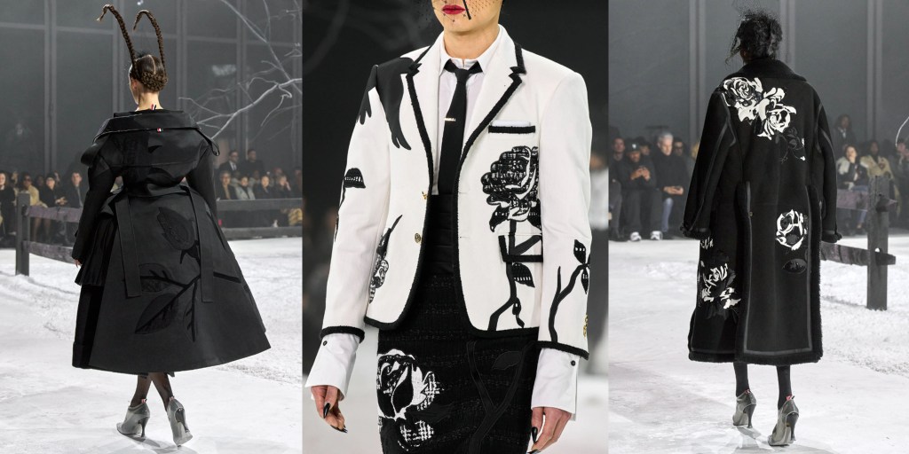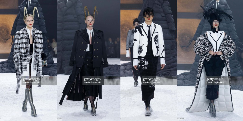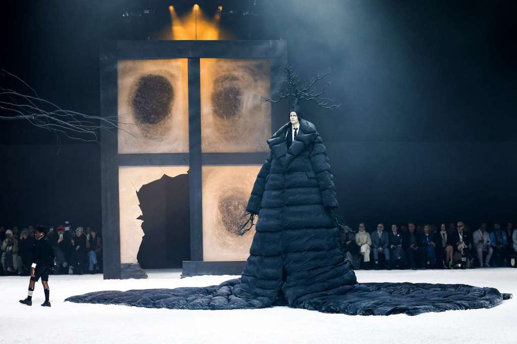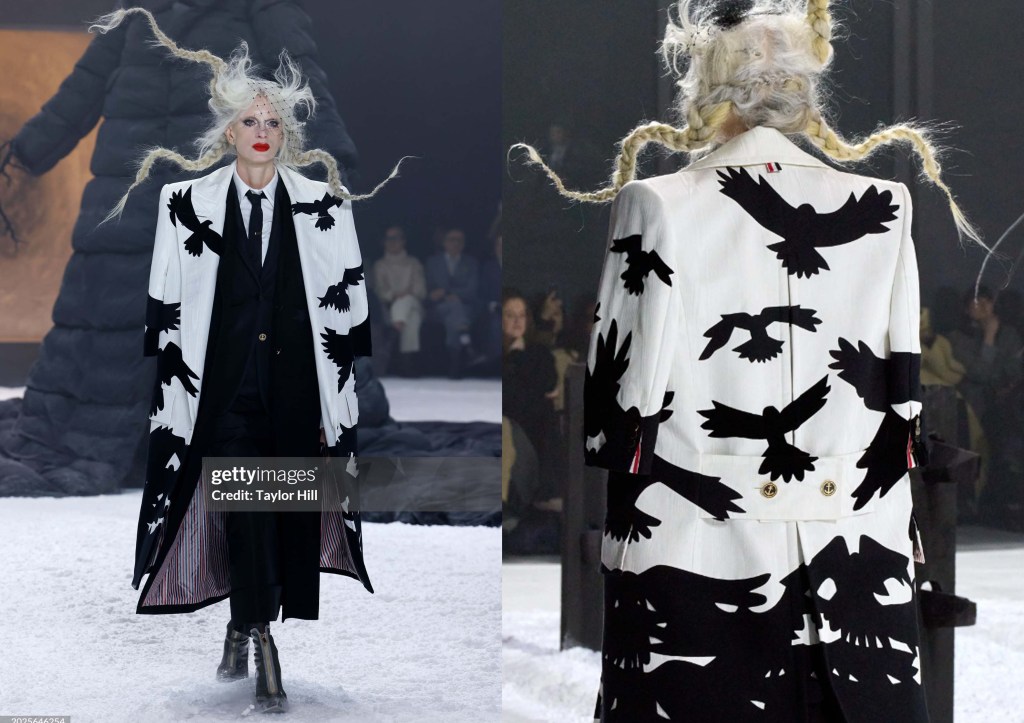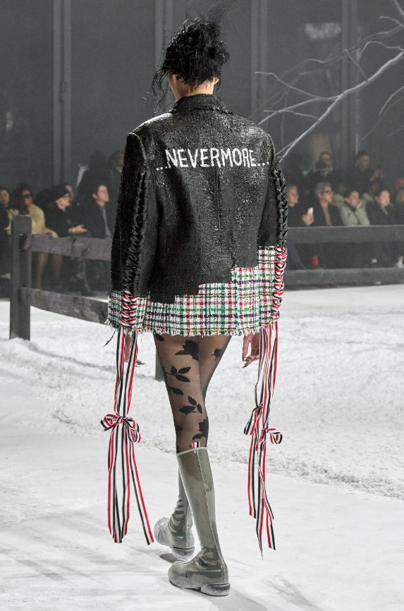 Tras una temporada ausente, Thom Browne regresó a la Semana de la Moda de Nueva York y ocupó el lugar de clausura de forma espectacular. La última vez que se subió a una pasarela fue en julio, cuando debutó en la Alta Costura en la Ópera Garnier de París con su característico estilo teatral. Hoy ha vuelto al Shed de Hudson Yards, donde puso en escena por última vez su propia versión de El Principito. En esta ocasión, el poema de Edgar Allan Poe El cuervo (1845) inspiró su puesta en escena: en un patio nevado, un árbol de extremidades desnudas vestido con un abrigo gigante de Thom Browne montaba guardia, con un modelo animando sus ramas; detrás había una ventana iluminada con un cristal roto por el que salían los demás modelos.