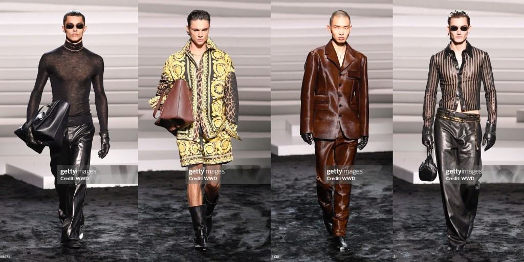 En la rueda de prensa, Versace hablaba de chicas rebeldes y chicos brillantes y tímidos. La chaqueta de Prince de Versace, entallada hasta la cintura con hombros anchos y diseñada para que pareciera más alto de lo que medía, sirvió de modelo para la sastrería de este desfile.