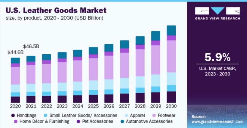 - El tamaño del mercado de artículos de cuero se estima en 304 mil millones de dólares en 2024, y se espera que alcance los 376 mil millones de dólares en 2029: