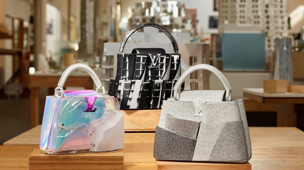 Vuitton ha presentado la colección Louis Vuitton x Frank Gehry en Art Basel Miami Beach. La mayoría de las piezas son reversiones de los emblemáticos bolsos Capucines de Vuitton. Algunos ejemplos de ello son una sorprendente técnica de serigrafía en 3D que confiere a la piel de becerro el aspecto del exterior de cemento de un edificio de Gehry. O la impresionante marquetería que trabaja piezas de cuero rojo en forma de pez. Después de todo, eso es lo que cabe esperar del hombre que diseñó el Pabellón Olímpico del Pez en Barcelona y la escultura llamada Danza del Pez en Kobe (Japón). Mención aparte, el mítico Museo Guggenheim de Bilbao, o las bodegas de Marqués de Riscal en La Rioja.