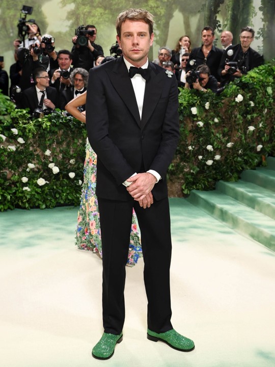 - Jonathan Anderson llevaba un smoking negro, con camisa blanca y pajarita negra. Los zapatos eran de la última colección de Loewe, en color verde y cubiertos de pedrería.