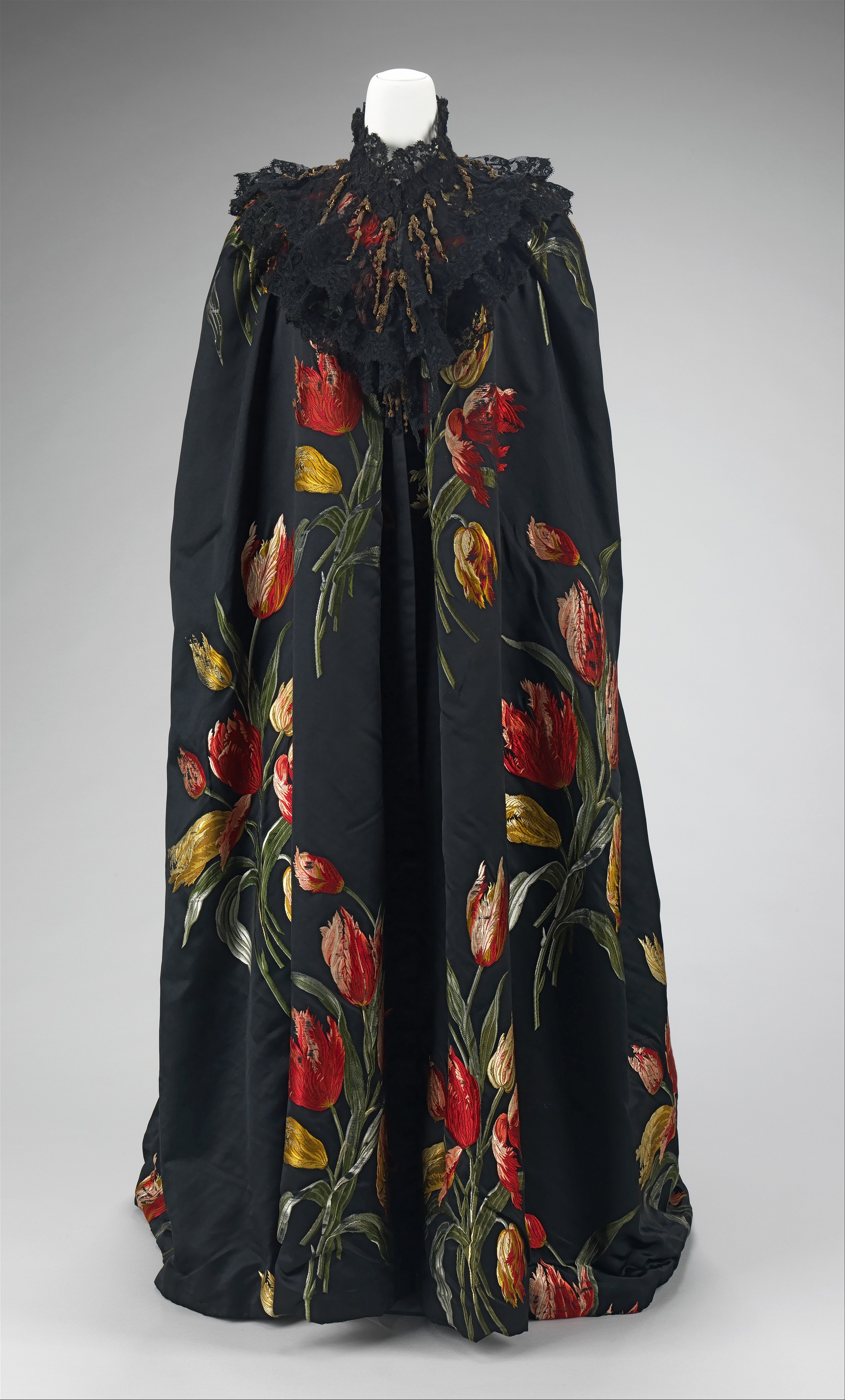 - Anna Wintour llevaba un vestido blanco bordado y un abrigo tuxedo negro extralargo de la colección FW 2024 de Loewe, customizado con plumas de colores bordadas, imitando flores. El look reinterpretaba una de las piezas que forman parte de la exposición de este año: una capa de Charles Frederick Worth de 1889, llamada “Tulipes Hollandaises”, con tulipanes exquisitamente bordados.