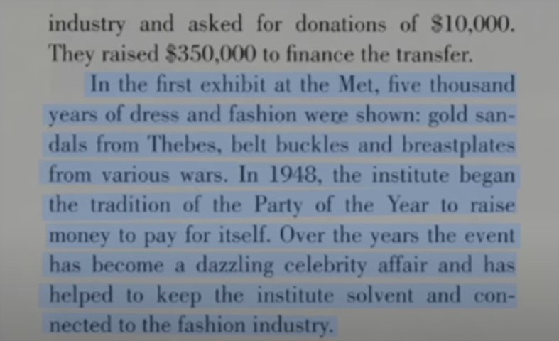 Su filosofía era sencilla: mostrar la ropa como símbolo de belleza, como parte del embellecimiento de la vida. Pero no fue hasta 1948, gracias a la legendaria publicista de moda Eleanor Lambert, cuando nació la gala anual de recaudación de fondos. A diferencia de otros departamentos del museo, el Instituto del Traje se autofinanciaba, gracias a la gala, que se apodó inmediatamente “La fiesta del año”, un ejercicio de marketing magistral.